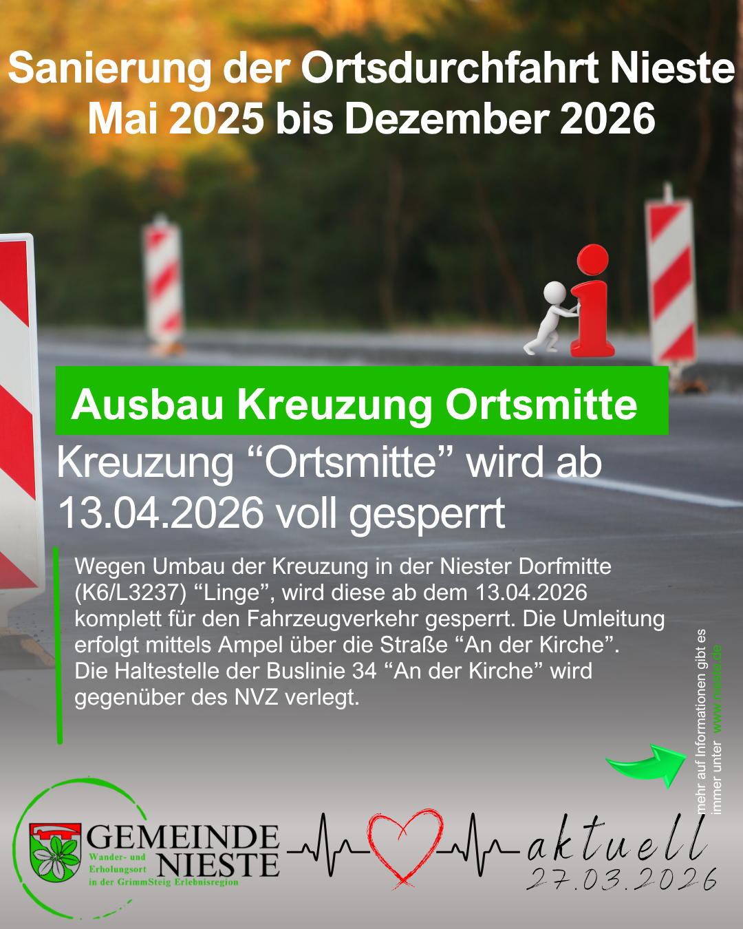 die Bauarbeiten in unserer Ortsdurchfahrt schreiten weiterhin gut voran. Ein wichtiger nächster Schritt steht nun unmittelbar bevor: Ab dem 13. April beginnt der Umbau des zentralen Verkehrsknotens in Nieste – also genau dort, wo Witzenhäuser Straße, Kasseler Straße und Kaufunger Straße zusammenkommen.