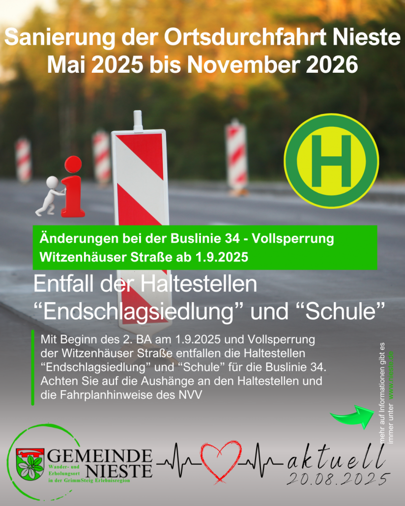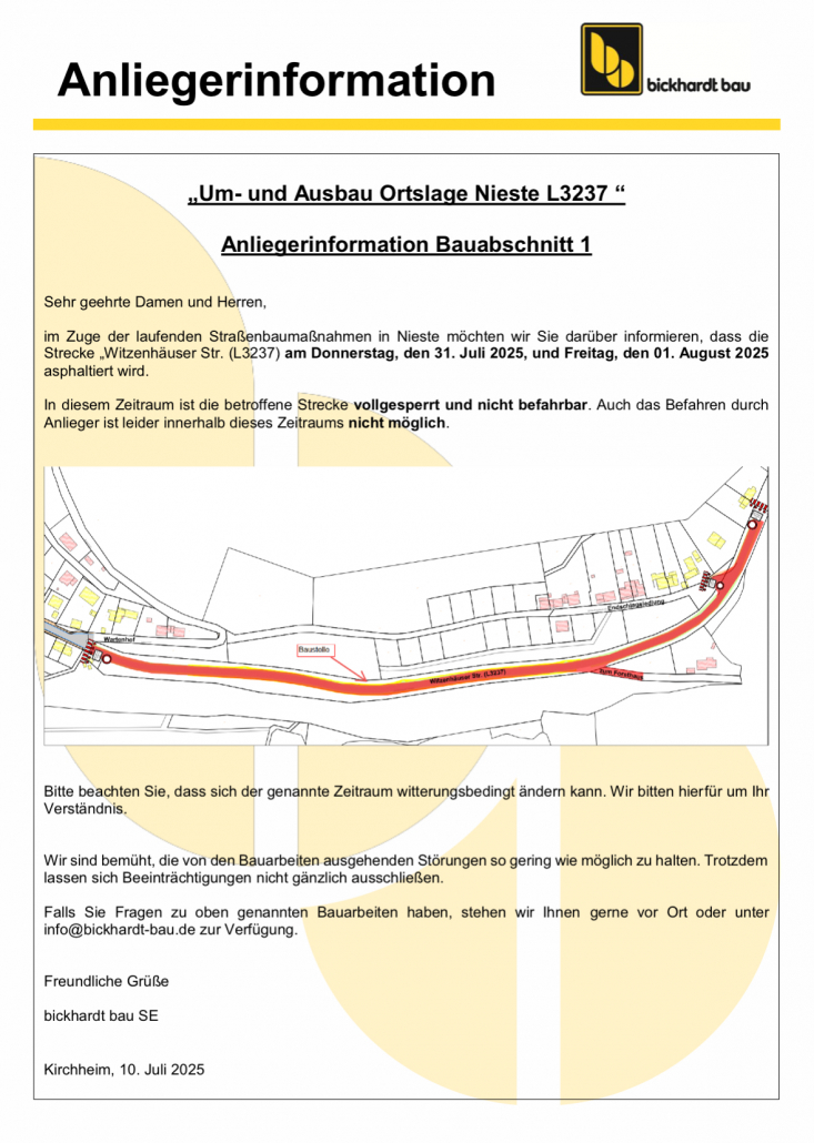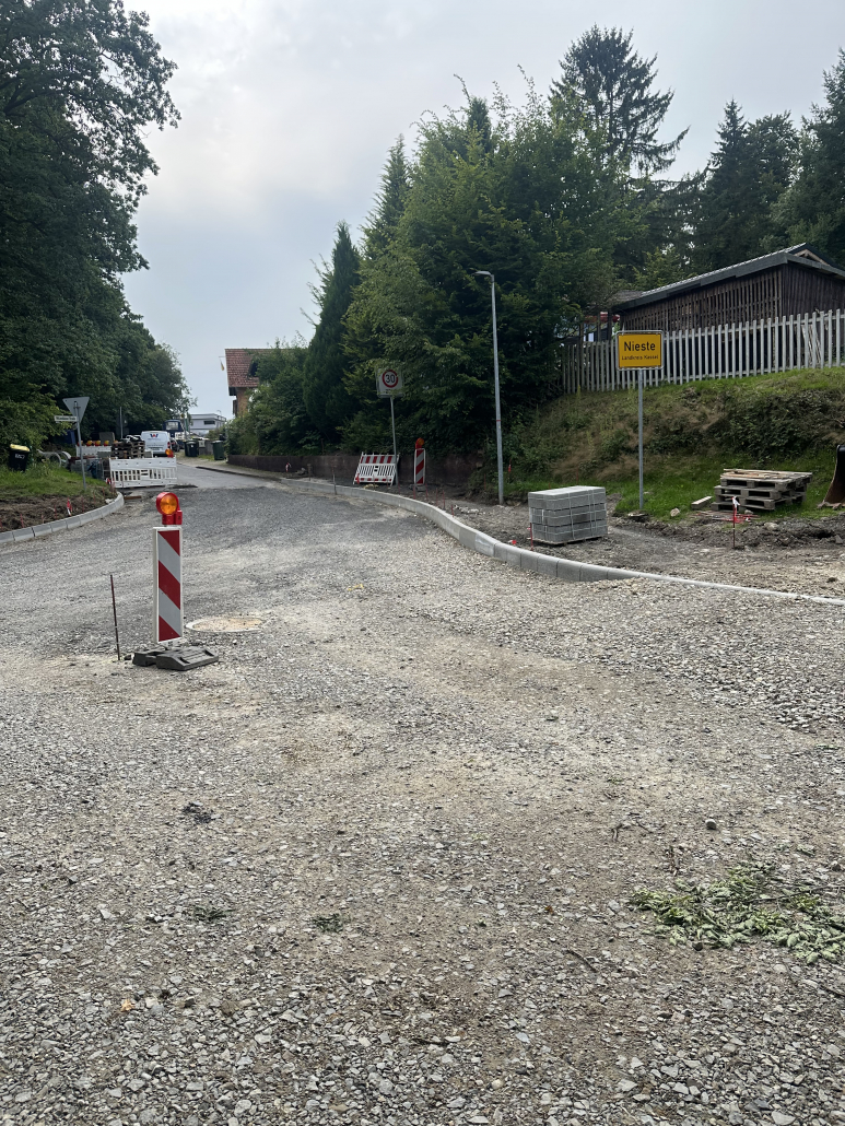 Am 01.09.2025 startet im Rahmen des Ausbaus der OD Nieste der 2. Bauabschnitt . Gebaut wird dann bis voraussichtlich April 2026 in der Witzenhäuser Straße bis Ortsmitte. Begonnen wird mit dem kompletten Abfräßen der Fahrbahndecke. Im Anschluss folgt der komplette Abriss der Borde und Gehwege.