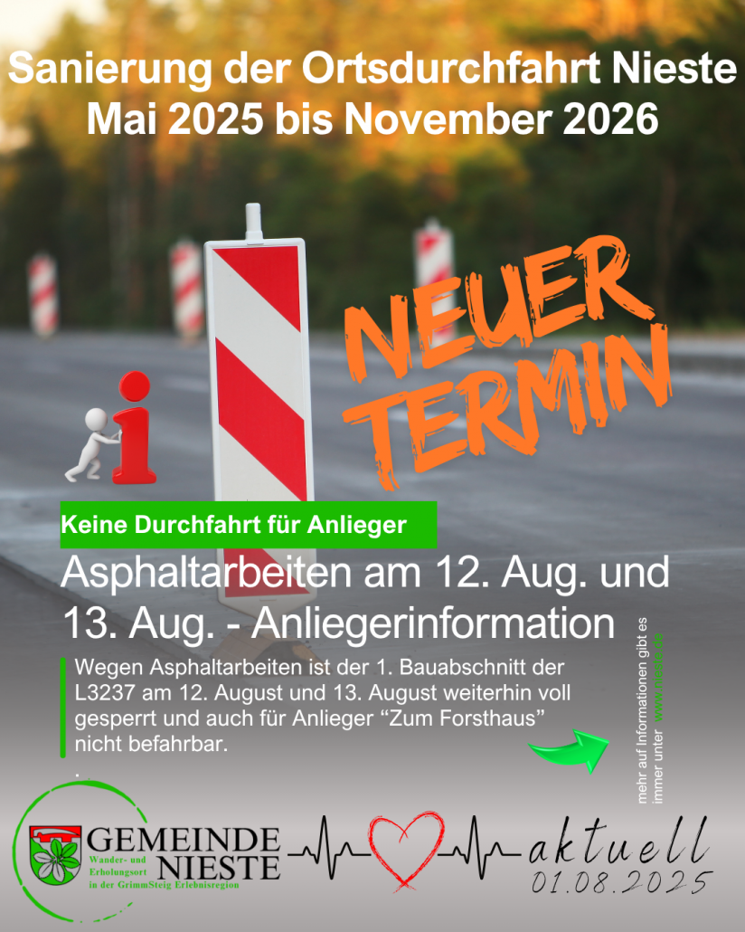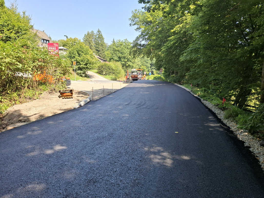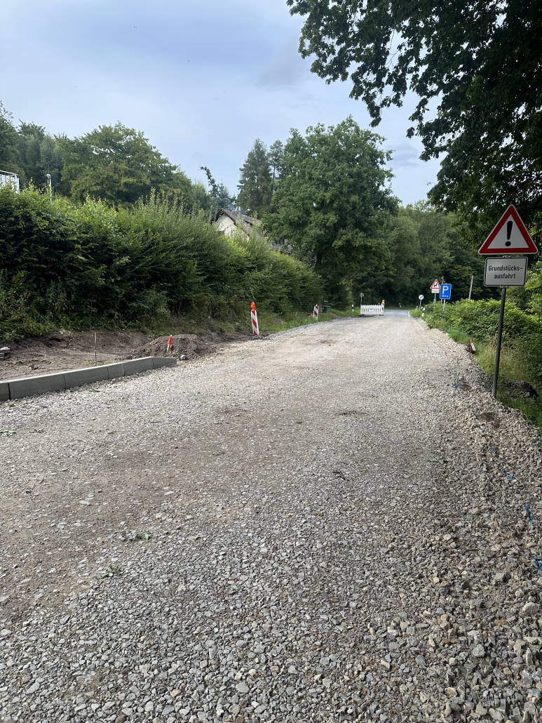 Am 12.08. und 13.08.2025 wird der Asphalt der Tragschicht eingebaut. An beiden Tagen kann die Strecke auch für Anlieger, z.B. der Straße „Zum Forsthaus“ nicht befahren werden, wie Bickhardt Bau den Anliegern mitgeteilt hat.