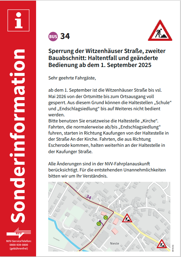 - Die Ortsdurchfahrt Nieste ist für den überörtlichen Durchgangsverkehr von und nach Witzenhausen weiterhin gesperrt. Es gibt eine großräumig ausgeschilderte Umleitung über Kaufungen, Helsa, Großalmerode nach Witzenhausen und umgekehrt.