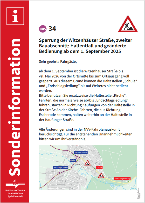 Die Witzenhäuser Straße ist während der Bauzeit voll gesperrt, d.h. die Sperrung bleibt auch für den Durchgangsverkehr von und in Richtung Witzenhausen noch mindestens bis April 2026 weiterhin voll gesperrt.